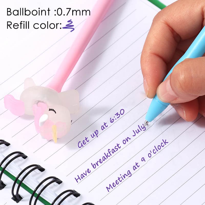 The cute ballpoint pen has a clever top design—soft silicone shaped like a rainbow horse. It feels comfy, adds childlike creativity, and a fun charm. Gently tap it, and red-blue lights flash, making writing dreamy.