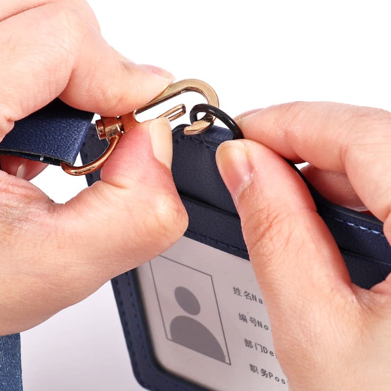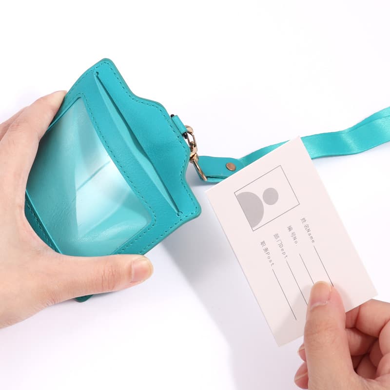 This name badge holder’s made of good PU leather. It lasts long, won’t wear out, and feels smooth. Skilled workers hand - stitched it, lines are neat, no breaks. Front has a clear window for info; back’s smooth PU leather to protect.